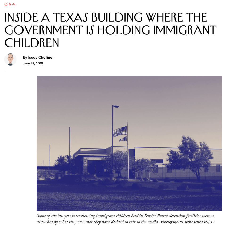 Isaac Chotiner, Inside a Texas Building Where the Government Is Holding Immigrant Children, The New Yorker (June 22, 2019).